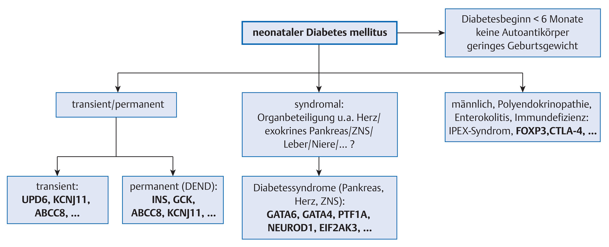 - K-ATP-Kanaldefekte und sehr seltene, rezessive Formen oder Diabetessyndrome müssen aufgrund des spezifischen Symptommusters molekulargenetisch untersucht werden.